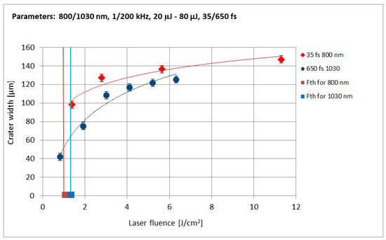 Figure 7 shows a comparison between the results obtained for femtosecond and sub-picosecond laser. Vertical lines represent theoretical ablation thresholds, as calculated in Table 1. Other beam parameters were picked as close as achievable for both lasers. Pulse energy varied from 20 µJ to 80 µJ and the wavelength was in the IR range.