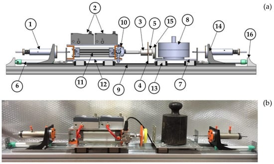 Figure 3 shows the CAD model and actual HIL equipment specimen, whose component details are reported in Table 1. The pneumatic actuator of the AP (11) and an impacted mass (8), which represents the subject, are placed on two independent plates, (12) and (7), respectively, which slide on linear guides (9) by means of carts (13) and are connected to the fixed frame by means of viscoelastic dampers (1), which respectively model the passive reaction of the operator and of the subject. The two valves (2) are placed just above the cylinder in order to shorten the pipes and hence to improve the dynamic response of the actuator. The potentiometers (6) are linked in parallel to the viscoelastic dampers and are used to measure the absolute position of cylinder body and mass. The laser sensor (10) is fixed to the body of the cylinder and is used to measure the cylinder stroke. A load cell (5), along with its support (3), is fixed to the rod end and is integral with the target of the laser sensor (4) as well as with the striker (15) placed at the end of the perturbator.