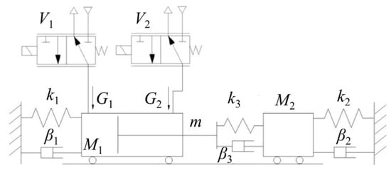 The physical model of the HIL equipment is depicted in Figure 4. The interaction with the operator who handles the device is taken into account by a viscoelastic impedance (k1 and β1) connecting the AP to the fixed frame. The human subject can be also assumed as a second mechanical impedance (M2, k2 and β2), thus emulating only the passive response of the human body. The mechanical characteristics of the end striker, combined with the properties of tissues in the contact area, are represented by constants k3 and β3, which have been defined with a Kelvin–Voigt model. M1 and m are, respectively, the masses of perturbator’s body and of piston + rod. G1 and G2 are the air flow rates entering the cylinder’s chambers, regulated by three-ways flow proportional valves V1 and V2. All parameters used in the HIL equipment model are listed in the nomenclature of Table 2.