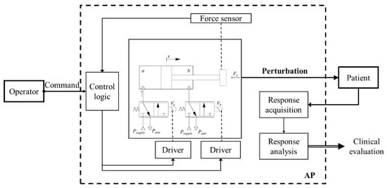 In order to investigate the performance of the AP under actual operating conditions, the “Hardware-In-the-Loop” (HIL) approach was adopted, based on the integration of the AP in a specific bench capable of emulating its interaction with the operator and with the subject on trial, as shown in Figure 2. An experimental bench, used in previous works on the same topic [,], was prepared for testing several versions of the AP. An accurate analytical model of the whole system was derived. The simulations of the dynamic behavior of the model were aimed both at the design of the AP and its control, and at the definition of the most effective characteristics of the same experimental bench.