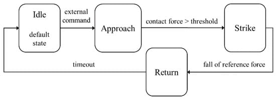 Basically, the AP must track a given reference profile of the contact force, with particular focus on the desired value of the force impulse. As described in [], the control logic is based on a state-machine architecture, with the sequence of four phases (idle, approach, strike, return) triggered by an external command. A scheme is reported in Figure 10.