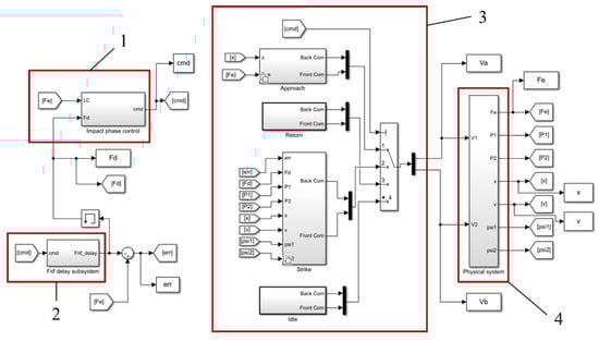 The only feedback signal used to perform the force control during impact is provided by the load cell, whereas the motion of the piston rod during approach and return phases (i.e., before and after the contact) could be controlled in open or closed (e.g., by position or velocity feedback) loop. In any case, it is essential to select the appropriate values of the valves’ command signals in order to perform fast transients. The control logic enables the switching between motion control phases and the force control strike phase, which is based on a simple PI controller. The logic is implemented in Simulink® (The MathWorks, Inc., Natick (MA), USA), Stateflow® toolbox, and directly uploaded on a Real-Time Target Machine (dSPACE®, Paderborn, Germany) used for data acquisition and control (200 Hz sampling frequency).