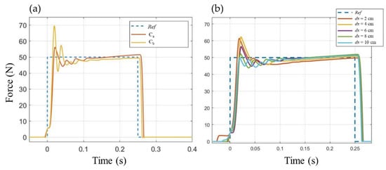 Evaluation of force tracking accuracy (fixed constraints, desired impulse duration = 250 ms, kp = 3.1, ki = 23.9, valve Vb); Ref refers to the reference force profile. (a) Comparison of performance provided by cylinders Ca and Cb; (b) influence of initial distance dx between perturbator tip and stricken mass, using cylinder Ca.