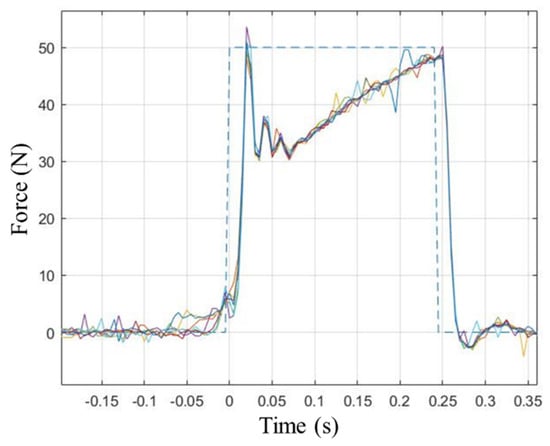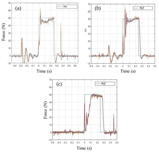 As shown in Figure 13, the system demonstrated a good tracking accuracy in fixed constraints configuration. Figure 14 shows the force tracking results when Cb and Vb were selected in a more realistic scenario, i.e., when both carts were free to move under viscoelastic constraints. Although force profile tracking was less accurate, the perturbations were still repeatable and capable of providing quite accurate values of the force impulse.