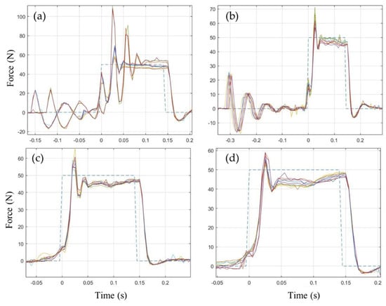 Experimental force tracking, with viscoelastic constraints, cylinder Cb and valve Vb. Open-loop motion control (a–b) and closed loop motion control (c–d) during phase II. Initial distance dx: 0.05 m (a–c), 0.08 m (b–d). The square waveform in each plot is the reference force profile. Each plot shows six consecutive perturbations.
