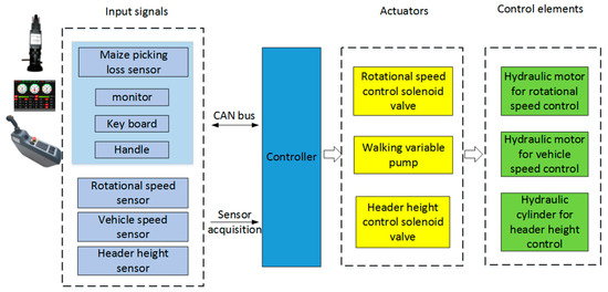 Figure 2 shows a structural block diagram of the hardware components for the intelligent control system of the maize harvester. The intelligent control system comprises sensors, the intelligent controller, actuators, and hydraulic control elements. The controller was constructed with the programmable controller IMC T3654, which was specially designed for mobile machinery with a flexible input/output (I/O) port configuration and up to 90 ports. Inputs to the harvester control system include the rotational speed of the pulling rollers, operating speed, header height, maize picking loss, and button control signal (from a keyboard and handle). The maize picking loss sensor can obtain the maize picking loss rate by collecting image information of broken ears and sending it to the intelligent controller through the control area network (CAN) bus. The rotational speed sensor collects the rotational speed information of the pulling rollers. The speed sensor collects the vehicle speed information. The header height sensor detects the header height. These sensors send their information to the controller in real time. The keys and driving control handle are located on the armrest box assembly, which can send signals by the CAN bus to the controller according to the inputs of the operator in manual control mode. The sensor signals are processed by the controller, which then outputs the appropriate command signal to the actuators to adjust the cylinders or motors.