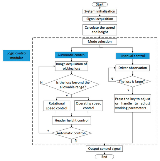 The control system software is divided into modules: for initialization, signal input and output, acquisition and processing of the sensor signals, CAN signal sending and receiving, and logic control. The logic control includes manual and automatic control modes. Figure 3 shows the software structure diagram. After the control system is initiated, the operator can set the driving mode (parking, road, or operation) and harvest mode (manual control or automatic control). In the road and operation modes, the operator can manually adjust the header height, driving speed, and rotational speed of the pulling rollers through the corresponding keys. When the operation mode is set to automatic, the system adjusts the maize picking loss adaptively. The control system exits automatic control and returns to manual control if any manual control key is touched during the automatic harvesting process.