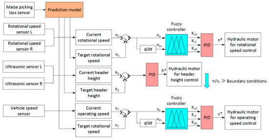 The control mode has two main control loops, namely, faster and slower loops. Previous research and experimental results have shown that the rotational speed of the pulling rollers has the most significant effect on the maize picking loss [21,22]. Thus, the rotational speed of the pulling rollers should be adjusted in real time depending on the maize picking loss rate, and the operating speed should match the rotational speed of the pulling rollers [23]. The faster loop regulates the rotational speed of the pulling rollers and the operating speed, and the slower loop regulates the header height. When the maize picking loss rate (MPL) exceeds the target range (0, MPLopt + ∆MPL), the faster loop adjusts the pulling rollers and operating speed. If MPL still exceeds the target range, the slower control loop fine-tunes the header height to optimize the maize picking loss rate. The values of the input parameters for both loops are determined by the prediction model and experimental data.