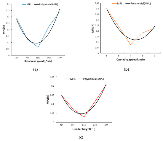 Relationship between the main factors and the maize picking loss rate respectively: (a) Relationship between the rotational speed of the pulling rollers and maize picking loss rate (MPL); (b) Relationship between the operating speed and MPL; (c) Relationship between the header height and MPL.