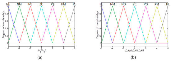 According to expert experience and test data, it can be known that the rotational speed of pulling rollers varies in the range of [0, 1500] , and the deviation of the normal working speed is within 50 r/min. When the rotational speed decline rate exceeds 30 (r/min)/s, it is considered that the pulling rollers have a tendency to block. Therefore, the basic domain of the rotational speed deviation is [−50, 50] r/min, and the lower limit of the rotational speed deviation change rate is set to −30 (r/min)/s, and its basic domain is [−30, 30] (r/min)/s. The output of the fuzzy control system is the correction value of the PID adjustment parameters, including Δ, Δ, and Δ. The basic domain of Δ is [−0.9, 0.9]. The basic domain of Δ is [−0.015, 0.015]. The basic domain of Δ is [−0.9, 0.9]. In order to ensure control accuracy, the basic domains of deviation, deviation change rate and the output variables (Δ, Δ, and Δ) are divided into 7 grades, and the quantization domains are all {−6, −4, −2, 0, 2, 4, 6}, the corresponding fuzzy language variable set is {negative large, negative medium, negative small, zero, positive small, positive medium, positive large}, denoted as {NL, NM, NS, ZE, PS, PM, PL}. The commonly used triangular membership function was selected as the membership function. The membership functions of input , and output Δ, Δ, and Δ are shown in the Figure 6.