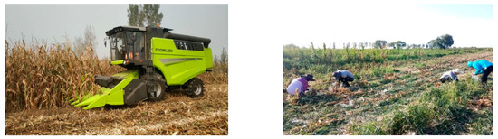 The field experiments were conducted according to the methods specified in GB/T 21961-2008 for maize harvesting machinery. Before the experiments, the moisture content of the maize kernels was determined to be 28–30%. Figure 8 shows the harvesting process. The test area was divided into a stable area of 20 m long, a measurement area of 20 m long, and a parking area of 15 m long. All dropped ears were removed from the measurement area before harvest. After harvest, fallen kernels (including the kernels in the straw), the broken ears, and newly dropped ears (including ears more than 5 cm long) in the same area were collected and weighed to measure the maize picking loss. The maize picking loss rate (%) was calculated as follows: