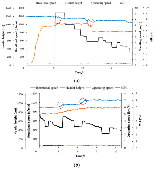 Before a harvest, the operator first adjusts the working parameters to empirical values based on personal experience. The initial rotational speed of the pulling rollers was set to approximately 1200 r/min, the header height was set to 500 mm in low cutting mode, and the harvesting was conducted at an operating speed of 7 km/h. Figure 10a shows the regulation process of the corresponding outputs when the maize picking loss rate was high, and the two red circles respectively indicate the first and second deceleration of the rotational speed of the pulling rollers. The ears of maize were harvested after approximately 5 s. At the beginning of the harvest, the excessively high rotational speed of the pulling rollers and operating speed caused the ears to bounce higher. The greater impact force caused more ears to be broken, and the maize plants were jammed on the header. The maize picking loss sensor shows a larger equivalent value for the maize picking loss, which means that the maize picking loss rate was high. At this time, the controller sent a flow reduction control command to the proportional valves to decrease the rotational speed of the pulling rollers according to the received maize picking loss rate and formulated control strategy. The rotational speed of the pulling rollers was adjusted twice and was reduced to approximately 1100 r/min. The operating speed was reduced from approximately 7 to 6 km/h. This significantly reduced the popping height of the ears, and the header was no longer congested. Thus, the maize picking loss rate was reduced to the allowable range. In order to calibrate the maize picking loss sensor and verify the validity of the intelligent control system, the maize picking loss rate was determined manually through statistics after the maize was harvested. The manually measured maize picking loss rate was 1.676%, and the acceptable loss rate in China is <4% (ear harvesting), which satisfies maize harvesting requirements.