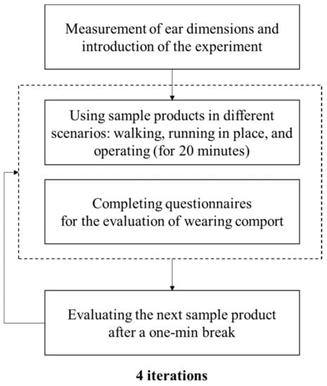 The overall process of this study is shown in Figure 1 and is divided into four stages. First, in the sample product selection stage, the product list was created based on market research about wireless earphones, and the wireless earphones for evaluation were selected through product selection criteria suitable for research. Second, in the ear dimension selection phase, the relevant ear dimensions were identified through the literature reviews on earphones and ear dimensions, and the area of the ear in contact with wireless earphones was identified to select the human dimension variables related to wireless earphones. Third, in the evaluation item selection phase, the wearing comfort and suitability of product design factors were selected for evaluation. Finally, the wearing comfort evaluation was conducted following an evaluation scenario, and the ear dimensions were measured before the evaluation.