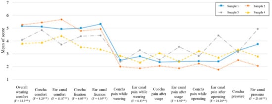 ANOVA analysis was performed to identify differences between four sample products, and the results, showing significant differences between products, are presented in Figure 4. Overall, both sample product one and sample product two were scored highly. In terms of wearing comfort without pain in the ear canal area, sample product one scored the highest. On the contrary, both sample product three and sample product four had relatively low scores in wearing comfort. In particular, sample product three was found to have a high level of pain in the area of the ear canal, and sample product four had low levels of comfort for the concha area and overall fixation.
