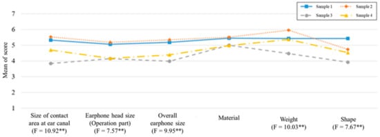 The results of the appropriateness of product design are shown in Figure 5. First, sample product one and sample product two received comparably higher scores than sample product three and sample product four did. In particular, sample product three scored the lowest for its weight, shape, and size of area contacting the ear canal while sample product four showed low appropriateness scores for its size of operation part (head size) and overall size.