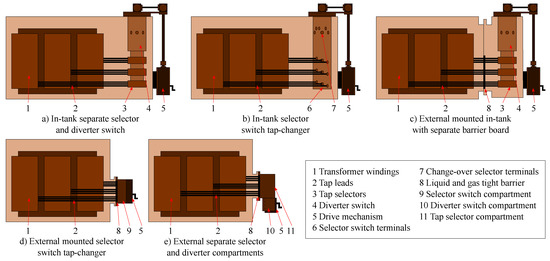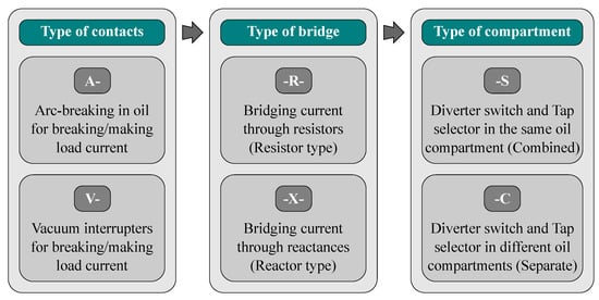 There are several OLTC classifications according to [30,31,32]. The classification proposed in [30] is one of the simplest and most commonly used. It is given in Figure 3.
