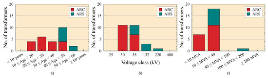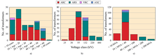 Distribution of power transformers defined as contaminated according to (a) age, (b) voltage class and (c) power rating.