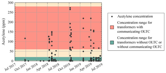 The presence of acetylene in the DGA results may indicate arcing or high-temperature thermal faults in the transformer [5,6,7]. Although the presence of acetylene in the DGA results does not always indicate a transformer fault, in old transformers with an on-load tap-changer (OLTC), oil or gases can be filtered from the OLTC compartment to the main transformer tank. Gas leakage between oil compartments may influence the DGA results and the identification of transformer insulation faults [6,7,8,9]. This case was shown in [10]: two faults were identified as low energy discharges (D1); later, it was determined by inspection of the equipment that it was oil contamination from the OLTC gases.