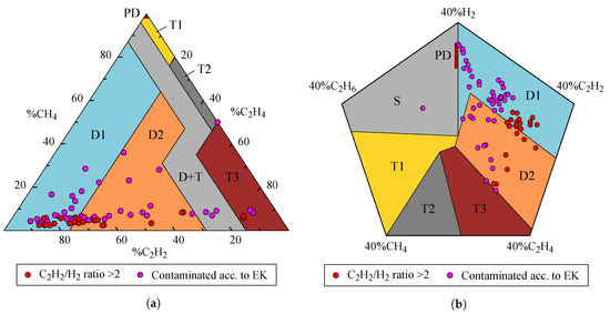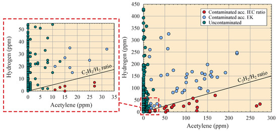 The presence of acetylene in DGA results may also be due to the filtration of OLTC gases. According to [6,7], the CH/H ratio can be used to determine the transformer oil contamination from the OLTC gases. When this ratio is greater than two or three, this indicates contamination.