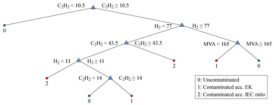 The output variable (known response) used in the training of the algorithm was the classification developed in Section 3, but the responses classified as contaminated were divided into two categories according to the CH/H ratio and expert knowledge (EK). Based on the division of the responses classified as contaminated into two classes and the responses of uncontaminated transformers, a total of three classes were defined, as can be seen in Figure 11. The responses of the 28 observations of transformers without OLTCs were defined as uncontaminated, which helped the algorithm to learn to classify them using the ML techniques.