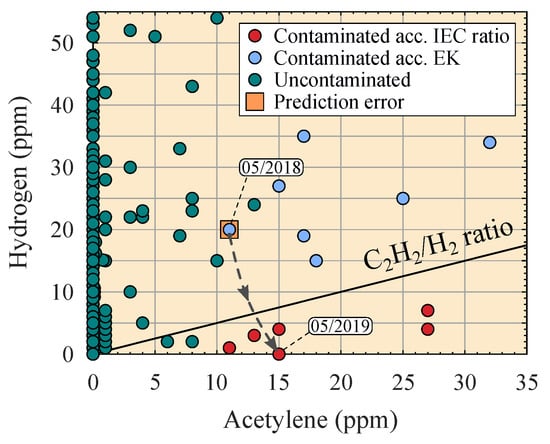 The DGA sample that was poorly predicted by the trained algorithm belonged to Transformer 4. This transformer had two DGA samples that were used in the algorithm training (Table 4 and Table 6). The responses of the DGA samples and the wrong prediction of the Transformer 4 are shown in Figure 13. The wrong prediction was defined as uncontaminated by the trained algorithm, while it was defined as contaminated according to EK, since its acetylene and hydrogen concentrations were 11 and 20 ppm, respectively. The wrong prediction was in the vertical zone generated between the responses of uncontaminated and contaminated transformers according to EK (Figure 11 and Figure 13); therefore, the trained algorithm could not determine the transformer contamination accurately.