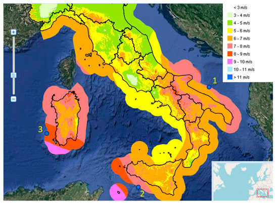 A view of ATLAEOLICO mean wind speed map at 100 m a.g.l./a.s.l. The three case study sites are shown: (1) Apulia, (2) Sicily, (3) Sardinia.