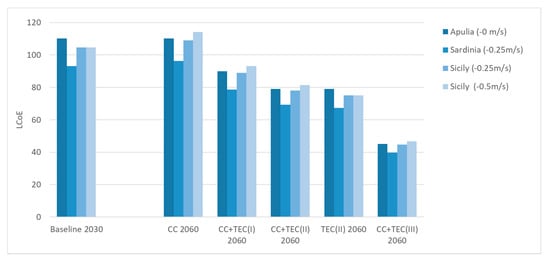 - In CC 2060, following the approach used by [], the first scenario at 2060 was assembled by focusing only on the resource change. Costs and technological parameters were not then modified in order to isolate climate change effects on capacity factors and consequently on LCoE. Results show an increase smaller than 10% in the LCoE at 2060 for case study 2 (Sicily) under a −0.50 m/s speed decrease hypothesis, and an increase smaller than 5% in the LCoE at 2060 for case studies 2 (Sicily) and 3 (Sardinia) under a −0.25 m/s speed decrease hypothesis. For case study 1 (Apulia) no resource variation was applied; therefore, LCoE did not experience any variation. Given these results, obtained without considering any technological improvement or costs decrease, it is inferable that climate change could play an antagonistic role in reducing LCoE of floating wind technology, although its impacts does not appear to be dramatic.