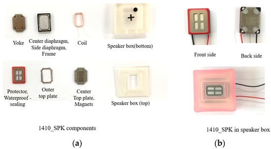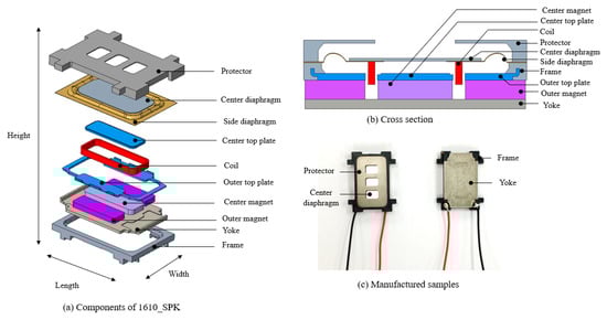 The prototype speaker, termed 1610_SPK, mainly consists of a coil, three neodymium permanent magnets, a center diaphragm, a side diaphragm, a yoke, and top plates. The prototype 1610_SPK has a length of 16.0 mm, a width of 10.0 mm, a height of 2.11 mm, and a coil resistance of 6.0 Ω. The coil and diaphragms are the moving components in 1610_SPK. The coil is attached to the diaphragms, and the vibration from the coil vibrates the diaphragms, which, in turn, generates sound. The remaining components are fixed and stationary. The design of the prototype 1610_SPK, its components, and manufactured samples are presented in Figure 2.