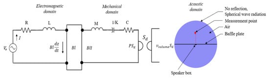 The electromagnetic and mechanical domains were coupled with a force factor. The force factor is in the governing equations as a form of back EMF and Lorentz force in Equations (1) and (6). In the acoustic domain, the volume velocity was coupled with the velocity from the mechanical domain. The acoustic pressure was calculated using the force. The relationships can be written as