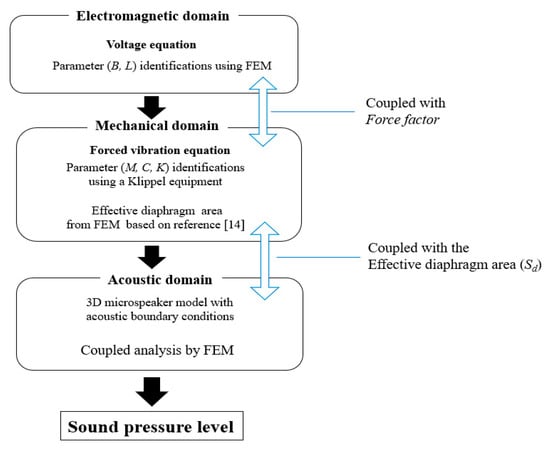 Analysis of the microspeaker was conducted by solving three domains: electromagnetic domain, mechanical domain, and acoustic domain. Three domains were coupled with specific parameters called the force factor and the effective diaphragm area. To calculate the SPL, three domains should be solved simultaneously using coupled analysis. This means that coupled analysis is used for solving a multiphysics system. The coupled analysis was based on solving the domains described in Figure 3, and the flow chart (procedures) of the coupled analysis is shown in Figure 4. The electromagnetic and mechanical domains were expressed as circuits with resistors, voltage sources, capacitors, and inductors. On the basis of the impedance analogy, the mechanical domain was formed in the circuit. The acoustic domain was modeled under 3D simulating experimental conditions for the SPL measurement. The parameters in each domain were found in advance before the coupled analysis to obtain the SPL. The prototype 1610_SPK was used in the analysis method.
