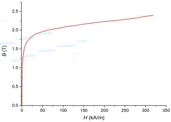 The top plates and the yoke were made of SPCC (Steel Plate Cold Commercial) and had a nonlinear relationship between B and H. B and H were correlated with a nonlinear parameter called magnetic permeability. This nonlinear value was calculated from the slope of the B–H curve. The B–H curve of SPCC is shown in Figure 5.