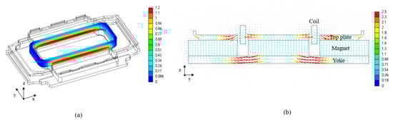 In the earlier versions of cellular phones, a round microspeaker was used. Hwang et al. introduced and analyzed circular and elliptical microspeakers [1]. To improve the sound pressure level (SPL), Hwang et al. also introduced a microspeaker with a new magnetic circuit [2]. Instead of using only the outer magnet, they also added a central magnet to increase the magnetic force [2]. To improve the space utilization in cellular phones, Kwon et al. developed a rectangular microspeaker [3]. Furthermore, Lee and Hwang developed a rectangular microspeaker in enlarged liquid-crystal displays that has modified structures to improve the acoustic performance, and new structures were added to the yoke to improve the flux density [4]. To develop thinner speakers for cellular phones, Lee et al. proposed a novel magnetic circuit in which the top plate was eliminated [5]. To reduce the thickness, Lee et al. used horizontally magnetized outer magnets instead of vertically magnetized outer magnets [5]. Advances in material research have also prompted engineers to use new materials in microspeakers. A piezoelectric speaker was developed for use in very thin devices [6,7]. The piezoelectric speaker has a multilayer structure that is thinner than the prototype microspeaker structure. However, this type of speaker is not widely adopted, owing to its high cost and poor acoustic performance at low frequencies. For a smartphone with a bezel-less display, indirect- and direct-vibration actuators were introduced and analyzed [8,9]. Compared with a microspeaker that generates sound by vibrating the diaphragm attached to the coil, these actuators are attached to the display panel, which generates sound by vibrating the elastic display panel. Microspeakers are widely used in other products. One example is a wearable device called the neckband. A neckband speaker with a passive vibrator was designed and analyzed by Kim et al. using Klippel measurement equipment [10]. The effect of the diaphragm material on the loudspeaker performance was analyzed by Wang et al. for a better frequency response [11]. Diaphragms with micro-corrugations were analyzed by Bae et al. to determine the effects on the acoustic performance [12]. In terms of the sound quality of the speaker module, one study proposed and optimized an L-shaped module [13]. To analyze a speaker system, Hernandez et al. proposed a method to obtain the nonlinear parameters in the speaker system, such as the force factor. Nonlinear parameters are defined as a function of the voice coil displacement [14]. With the advances in computational power, Reddy et al. were able to conduct an analysis of the acoustic performance of a microspeaker using a machine learning algorithm [15].