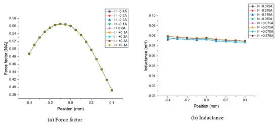 The average flux density on the coil of the prototype 1610_SPK was found to be 0.560 T. The flux density on the coil and its distribution in the cross section are shown in Figure 6. The results of the force factor and inductance are shown in Figure 7.