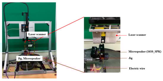 The lumped parameters of the mechanical system (M, C, and K) were measured using Klippel measurement equipment. Klippel measurement equipment is a laser-based measurement device that includes a power amplifier (PLX 1802), the Distortion Analyzer 2 (H1-DA2), and a laser scanner. For the measurement, electric wires were connected to the microspeaker, which was fixed using the stationary jig. The laser point was positioned at the center of the diaphragm. Figure 8 shows the Klippel equipment and its settings. Ten manufactured prototype 1610_SPK samples were measured, and the measured values were averaged. The measurement results are listed in Table 3.