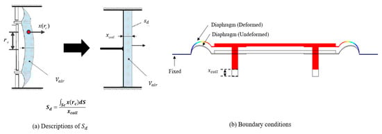 where P is the acoustic pressure, is the effective diaphragm area, and is the volume velocity. These two equations are coupled with the effective diaphragm area . Thus, an effective diaphragm area of 1610_SPK should be found. Jiang et al. suggested a method to obtain an effective diaphragm area [16]. Figure 9 illustrates how to determine the effective diaphragm area () and its boundary conditions for mechanical FEM analysis.