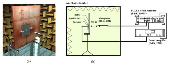 Experimental setup and equipment connections for the SPL measurement: (a) experimental setup in an anechoic chamber; (b) B&K equipment connections.
