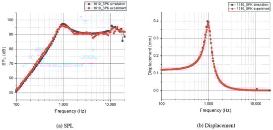Experiment and simulation results of 1610_SPK: (a) SPL and (b) displacement.