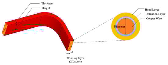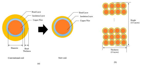 The coil consists of three main components: copper for the current flow, an insulation layer, and a bond layer. Owing to advances in technology, a coil with a thinner bond layer has been introduced, which enables a reduction in the coil height and thickness compared with the dimensions of the conventional coil used in 1610_SPK. A comparison between the conventional and the new coil is shown in Figure 17a. Figure 17b depicts the coil winding cross section of 1410_SPK; except for the bond layer thickness, the thicknesses of the copper wires and insulation layers are similar.