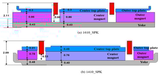 For the proposed microspeaker, 1410_SPK, a 0.077-mm coil diameter was used, unlike the 0.070-mm coil used in 1610_SPK. By using this coil with a larger diameter, we increased the mass and length of the coil by approximately 51% and 25%, respectively, compared with those of the prototype 1610_SPK. The coil specifications of 1610_SPK and 1410_SPK are listed in Table 6. Because a coil with a larger diameter and the same resistance of 6 Ω was used, the height of 1410_SPK exceeded that of 1610_SPK, making it unsuitable for newer smartphones. The yoke thickness around the coil and also the distance between the upper part of the yoke and the bottom surface of the coil were reduced for solving the height problem. Figure 13 shows the component thicknesses for 1610_SPK and the newly designed 1410_SPK. As shown in this figure, the distance between the bottom of the yoke and the top surface of the coil in 1410_SPK was less than that in 1610_SPK.