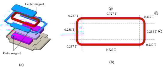 Flux density distribution in 1610_SPK: (a) magnet design and (b) flux density distribution over the coil.