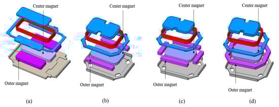 Magnetic circuit structures: (a) 1610_SPK, (b) 1410_SPK 3mag, (c) 1410_SPK 5mag, and (d) 1410_SPK_2mag (ring shape).