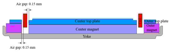 The top plates and the yoke, which are made of SPCC, are the important components of the microspeaker structure. The magnetic flux generated by the permanent magnets is concentrated on the coil through the top plates and the yoke. The air gap refers to the distance between the top plate and the coil, as shown in Figure 16. In microspeaker designs, the distance between the coil and the top plate is the same as that between the magnets and the coil. Additional center top plates, outer top plates, center magnets, and outer magnets can be used if the air gap is decreased, as a decreased air gap can improve the total force. The air gap of 1610_SPK was 0.15 mm. Previously, the achievable minimum air gap was 0.15 mm, owing to the manufacturing technology at that time. During the manufacturing process, the coil is inserted between the center top plate and the outer top plate, and then the air gap is manually checked by human eyes using a tool maker microscope (Mitutoyo).