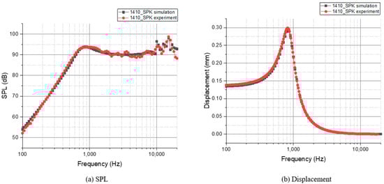 Experiment and simulation results of 1410_SPK: (a) SPL and (b) displacement.