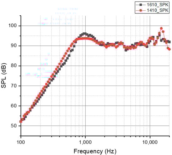 The SPL of the prototype 1610_SPK and that of the newly designed 1410_SPK are compared in Figure 20. The average SPL of 1410_SPK at four low frequencies was found to be 79.79 dB. The SPL comparisons between 1610_SPK and 1410_SPK at four frequencies are listed in Table 10.