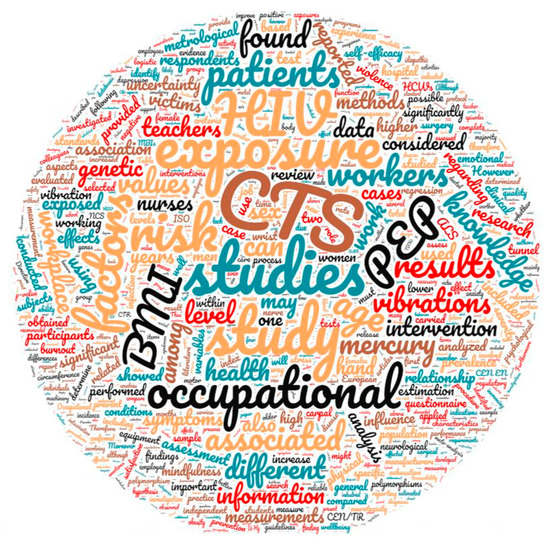 The most mentioned words were “occupational”, “study”, “studies”, “risk”, “factors”, “exposure”, and immediately after, by frequency, “knowledge”, “workers”, “workplace”, “associated”, “intervention”, and “health”.