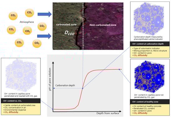 Importance of CO2 diffusivity as a decisive parameter for controlling carbonation rate of concrete. In this figure, the degree of carbonation of concrete is expressed as the hydroxyl concentration of cement hydrates. In the carbonated area, the pH of the pore solution is greatly reduced, and the rate depends on CO2 concentration in the atmosphere as an environment response. For noncarbonated area, it has an original pH value. The border between the two areas can be determined by spraying a phenolphthalein-alcohol indicator and this also can be influenced by OH− content. The CO2 diffusivity is a material parameter that can make all these decisions.