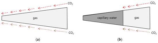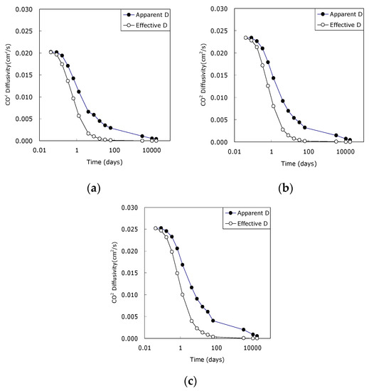 Therefore, the CO2 diffusivity can be divided into two diffusivities; (a) apparent diffusivity of the condition described in Figure 3a, ignoring the moisture and considering the total pores; (b) effective diffusivity of the condition described in Figure 3b, considering the effective pores through which moisture is excluded from the total pores and gas can penetrate. The calculation result was shown in Figure 4.