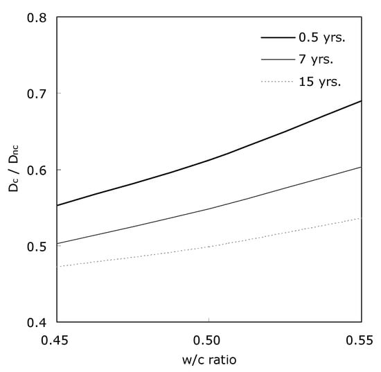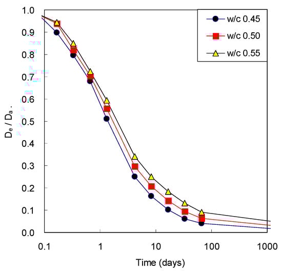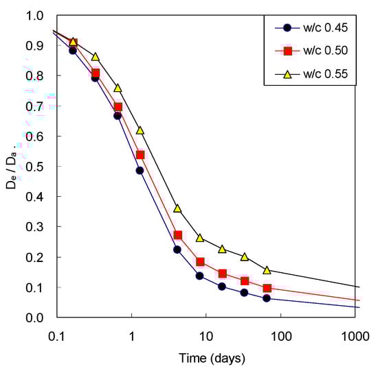 Figure 6 illustrates the ratio of the effective diffusivity and the apparent diffusivity of concrete with w/c ratio. The apparent diffusivity decreases with time because of only development of microstructure of cement paste, while the effective diffusivity decreases with time because of remained amount of pore water after consumption due to cement hydration as well as the microstructural development. For this reason, the difference between two diffusivities was not significant at the beginning of age; however, the difference was obvious with elapsed time. The ratio had decreased significantly to the level of 0.1 to 0.2 after 28 days. At early ages, the difference between two diffusivities was not high because cement was not sufficiently unhydrated and pore was highly filled with water. However, the difference between two diffusivities was clearly noticed with elapsed time because water was continuously consumed by the hydration reaction of cement as it became hydrated. Therefore, it is very important to consider water content in estimating gaseous diffusivity of cementitious materials.