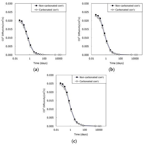 Figure 8 illustrates the difference between effective CO2 diffusivity and apparent diffusivity of concrete after carbonation. Like the comparative ratio in Figure 5, the ratio of carbonated concrete showed a similar trend.