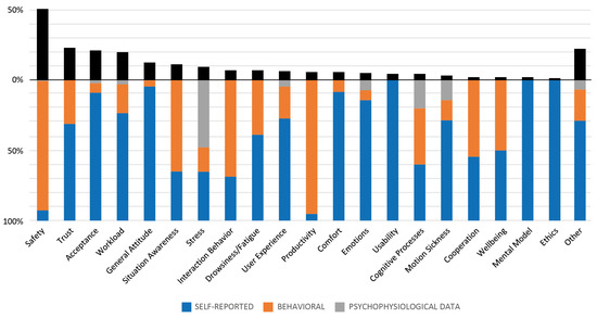 User Experience is mainly investigated by self-reported measurements np = 16, np = 5 collect behavioral data, only once psycho-physiological measures by capturing Heart Rate Variability is utilized. Various standardized questionnaires (n = 4) like AttrakDiff [113], UEQ [114], etc. are applied, or interviews (n = 4), and other qualitative methods like UX curve [112], think aloud, and sorting have been conducted. Behavioral data are collected by one paper regarding participants’ driving performance, e.g., acceleration, braking, speed, and lane changes. See Table 11. In total, np = 13 different parameters were collected across all papers investigating UX.